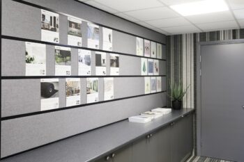 Bringen Sie diese schöne Kreation an die Wand – einen Druck in unserem schallabsorbierenden Material EcoSUND in verschiedenen Farben und Ebenen. Das Motiv ist von einem Rahmen mit Holzfurnier in Esche umgeben. Schallabsorbierendes Board für die Wandmontage.